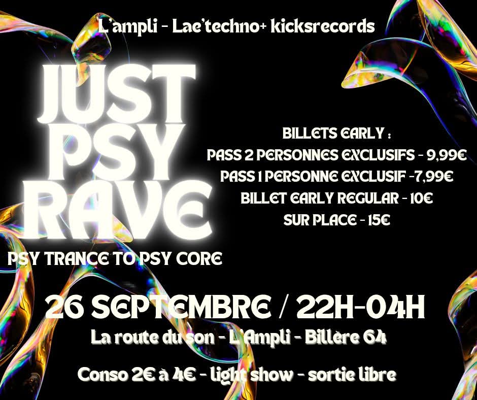 Après l’énorme succès qui a fait salle pleine lors de « Just be Rave », l’équipe de kicksrecords et de Lae’techno revient avec des DJ internationaux, nationaux et locaux pour un format psychédélique avec des sons psy trance, psy Techno et Psy Core pour l’expérience festive unique, rare et que vous attendez depuis longtemps : « JUST PSY RAVE » !