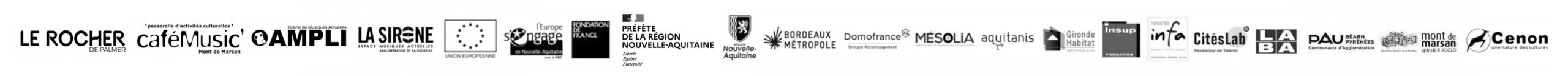Projet réalisé avec le concours de l’Union Européenne (Fonds Social Européen), à dimension régionale, piloté par le Rocher de Palmer (Cenon) et relayé sur le territoire par le Café Music (Mont de Marsan), la Sirène (La Rochelle), Ampli (Billère).