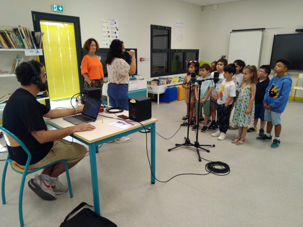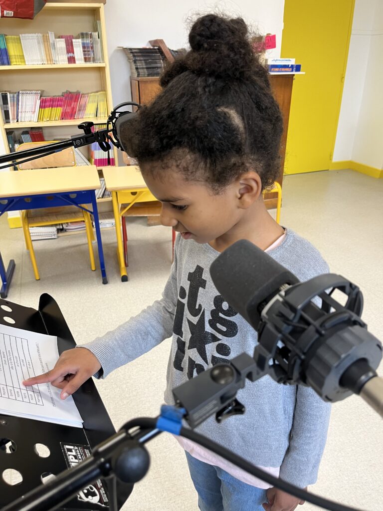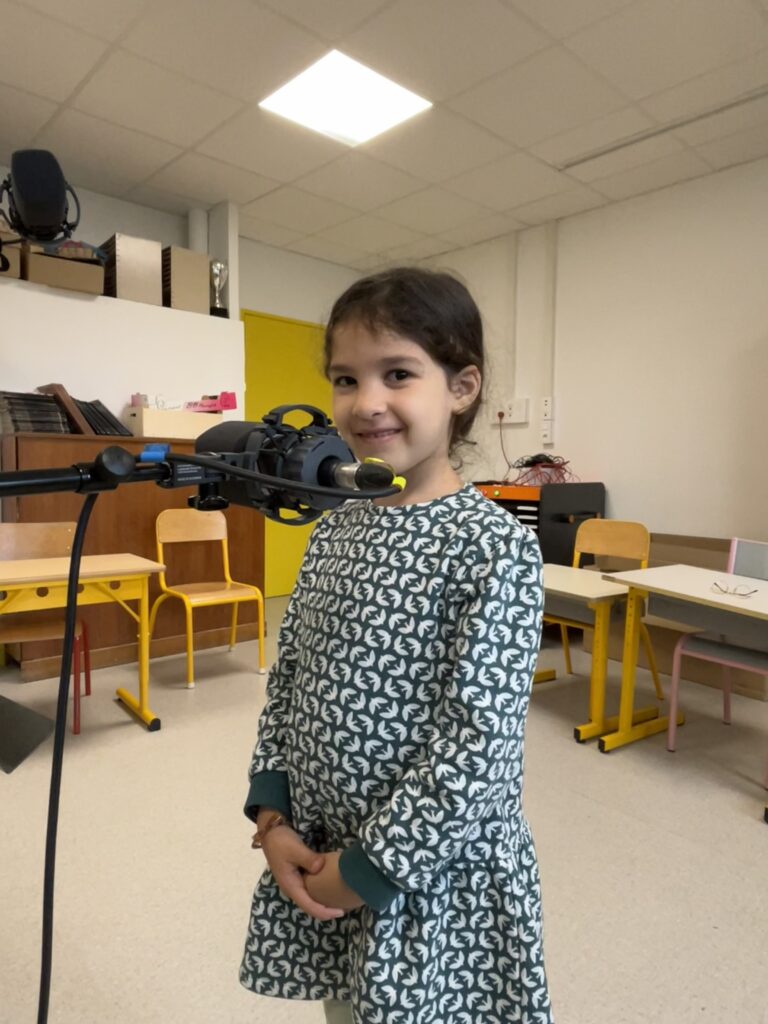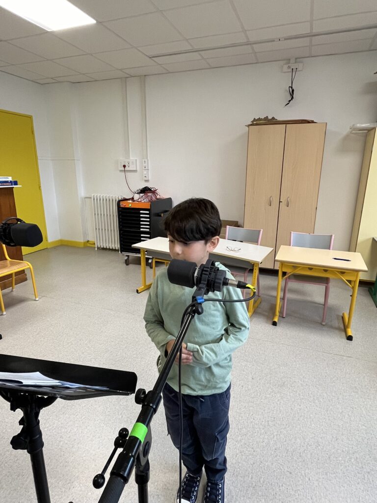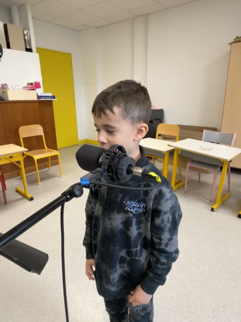Les écrits terminés, place à l’enregistrement ! Les élèves ont alors fait la connaissance de Jérôme, de Stéphane et d’Arthur ! ils sont arrivés à l’école avec tout leur matériel. Quelle joie à 7 ans de se faire enregistrer comme des pros ! Devant le micro, il y a d’abord eu un peu de stress. Et puis finalement, il a vite disparu et tous les élèves se sont bien amusés ! Il parait que même la maîtresse et les parents en ont profité … Et puis, les élèves se sont aussi faits interviewer, « comme des grands ! ». Au début, c’était un peu intimidant, mais finalement, ça fait de jolis souvenirs qu’ils pourront écouter toute leur vie !